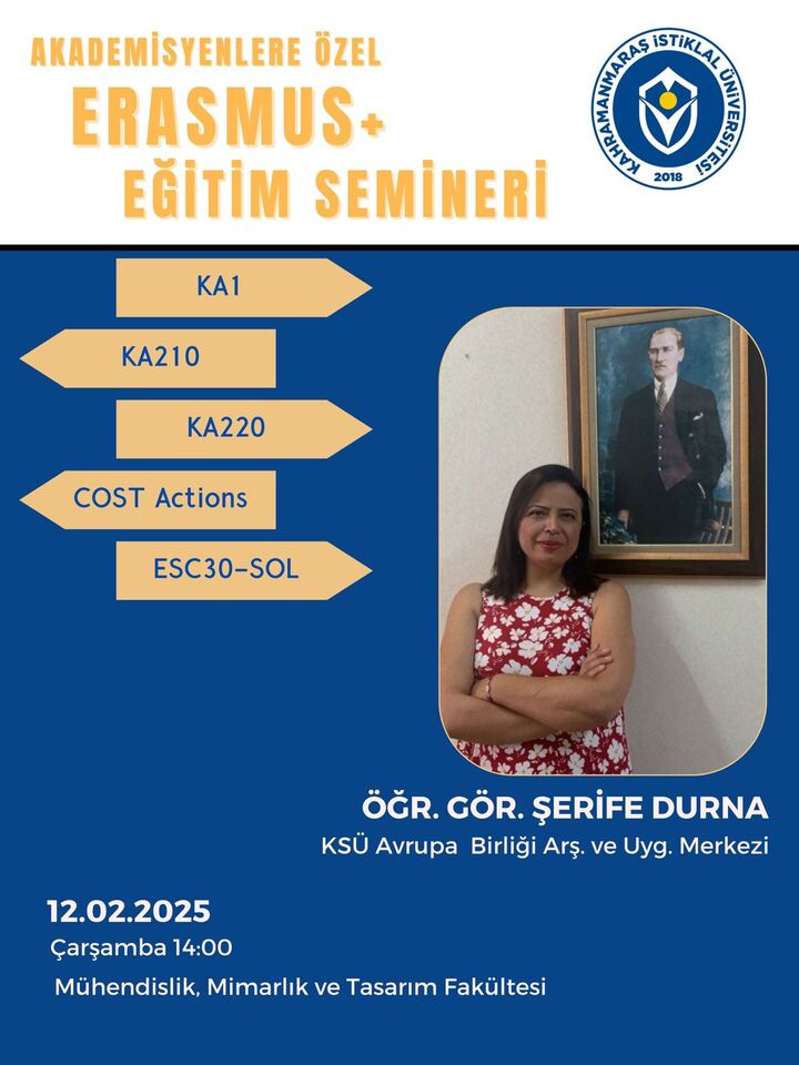 Kahramanmaraş’ın kurtuluşunun yıl dönümü olan 12 Şubat tarihinde Kahramanmaraş İstiklal Üniversitesi akademisyenlerine yönelik ERASMUS+ projeleri bilgilendirme toplantısı düzenledik. Toplantıya katılan öğretim elemanlarına kısa bir Eurodesk tanıtımının ardından KA1,KA2,ESC30 ve COST Actions projeleri ve başvuru süreçleri anlatılmıştır.